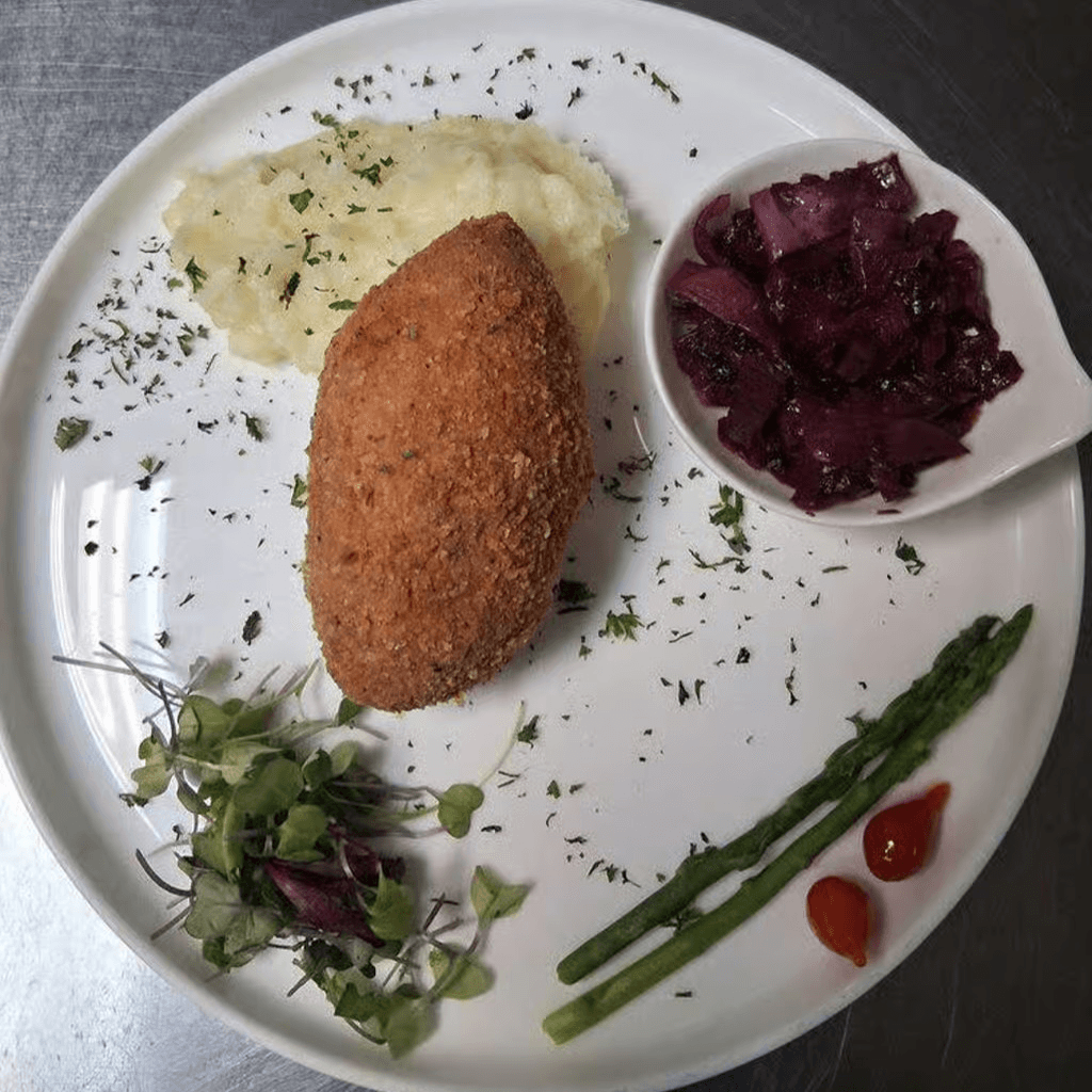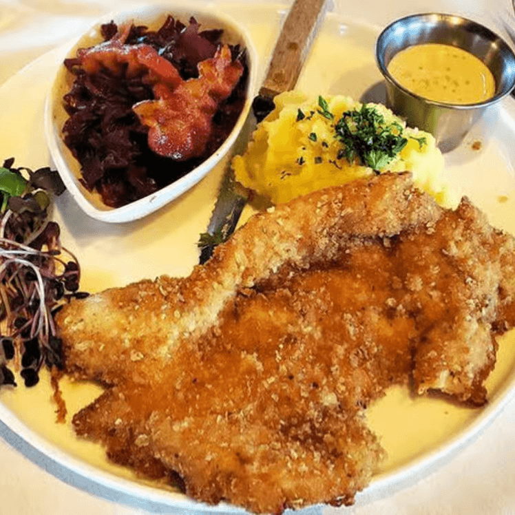 Served with mashed potatoes & sweet and sour cabbage, in German style. Served with delicious garden salad