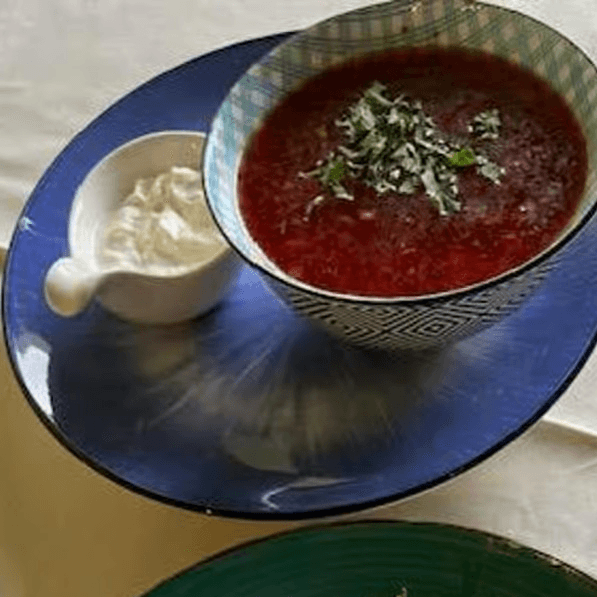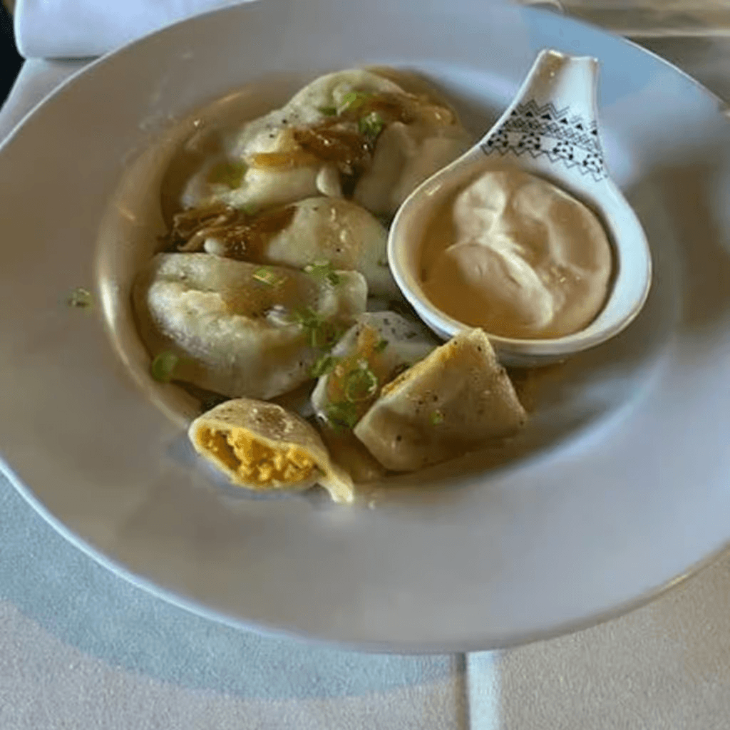 Soup, house salad, polish pierogi, bread with pesto, soft drink, dessert