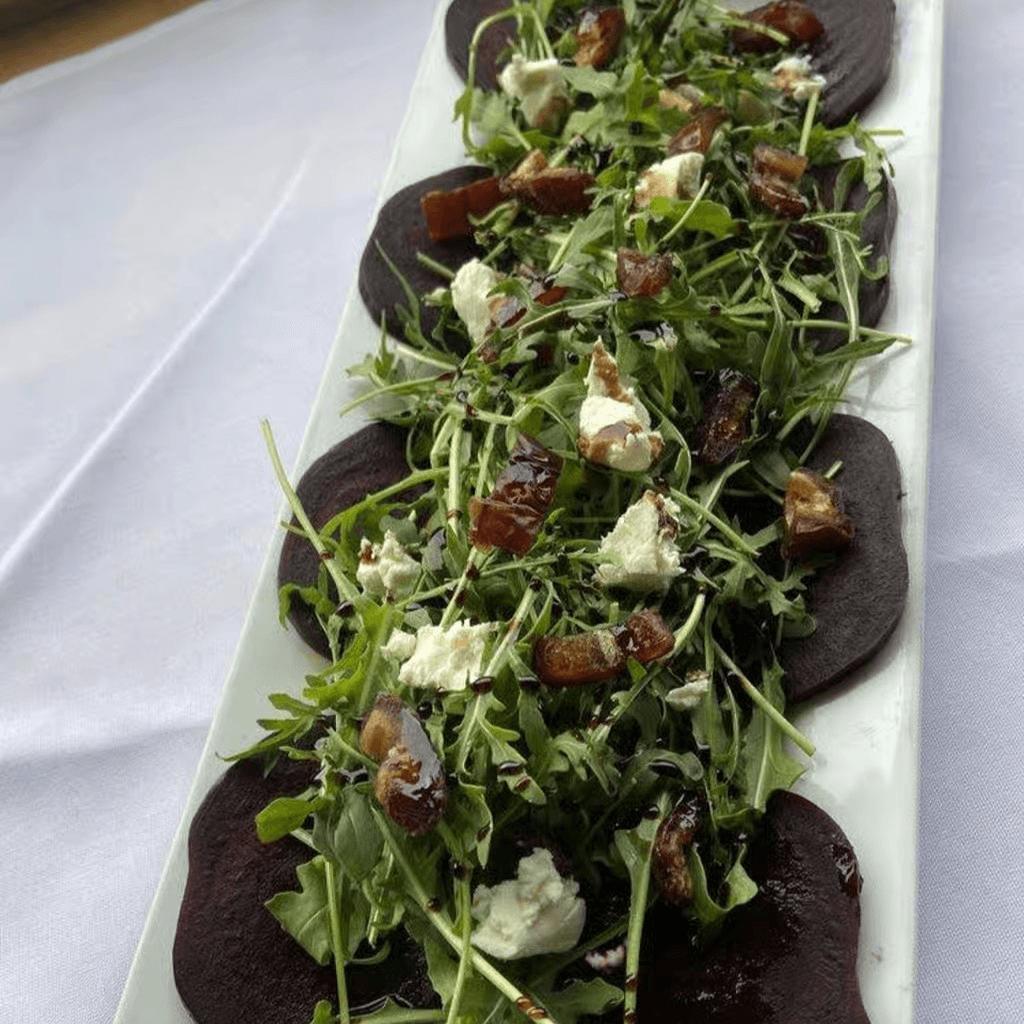 Fresh baby arugula, yellow and purple beets, goat cheese, pistachios, and maple balsamic glaze