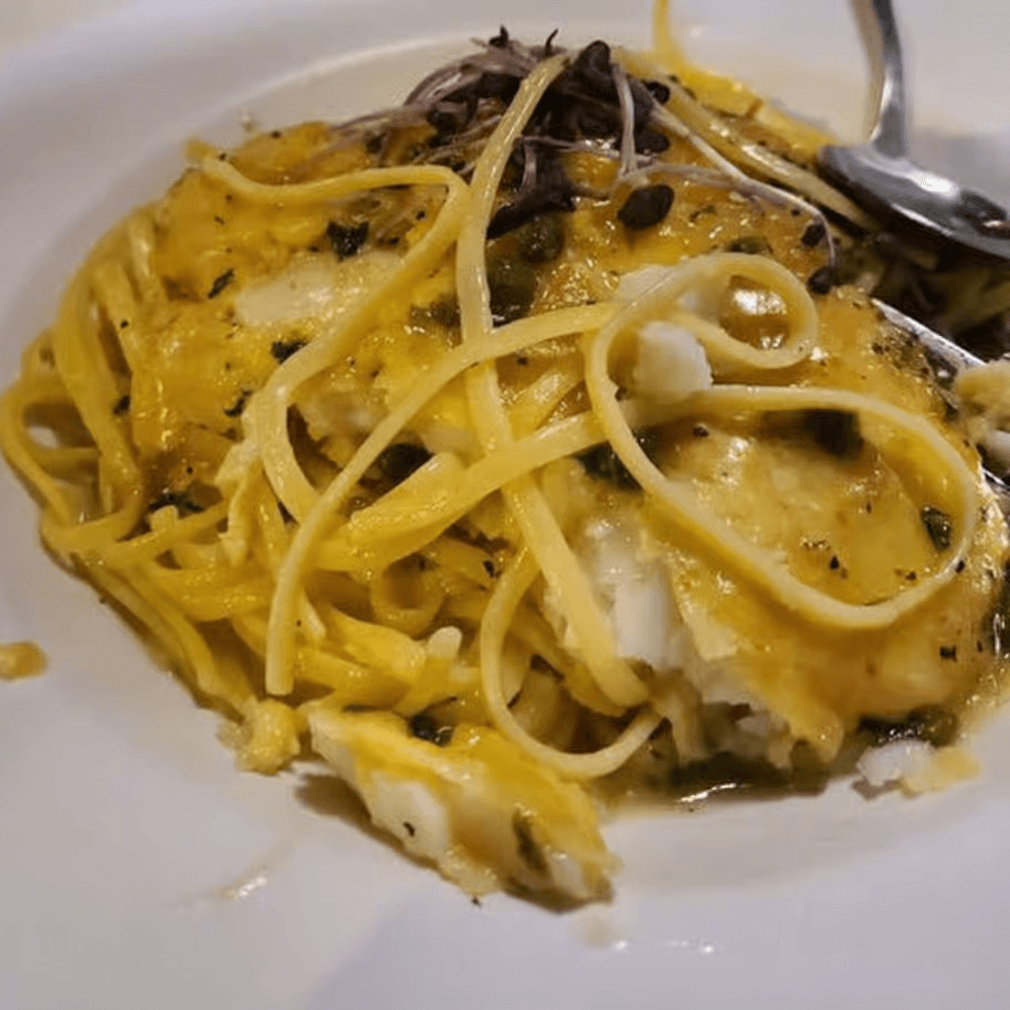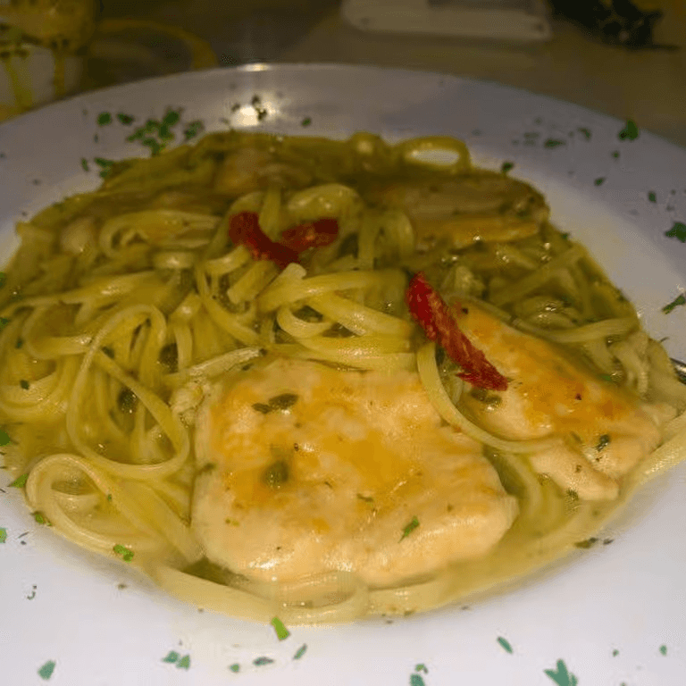 White wine, capers, lemon, garlic, butter sauce over pasta linguine. Served with delicious garden salad